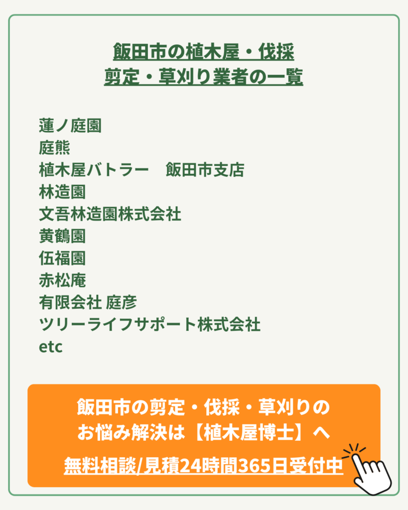 | 対応場所 | 個人邸、企業、国営公園(長野県飯田市を拠点に近郊エリアと推測) |