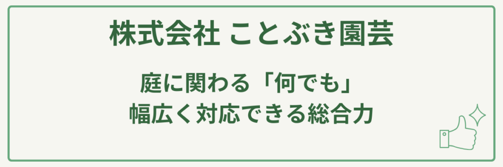 | 対応サービス | 和風庭園設計施工、洋風庭園(モダン、リゾートガーデンなど)、外構、植栽、剪定、除草、伐採、解体、盆栽・植木販売 |