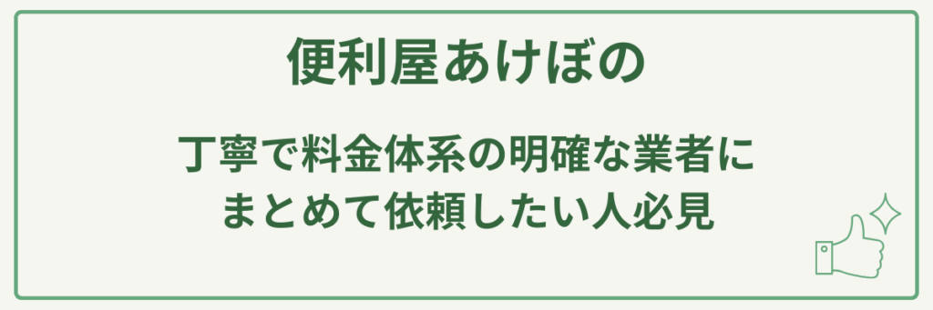 そのため、庭木の剪定や草刈りと一緒に、不用品の処分やお墓の管理をまとめて、地域密着の安心できる業者に依頼したい人におすすめの便利屋さんです。