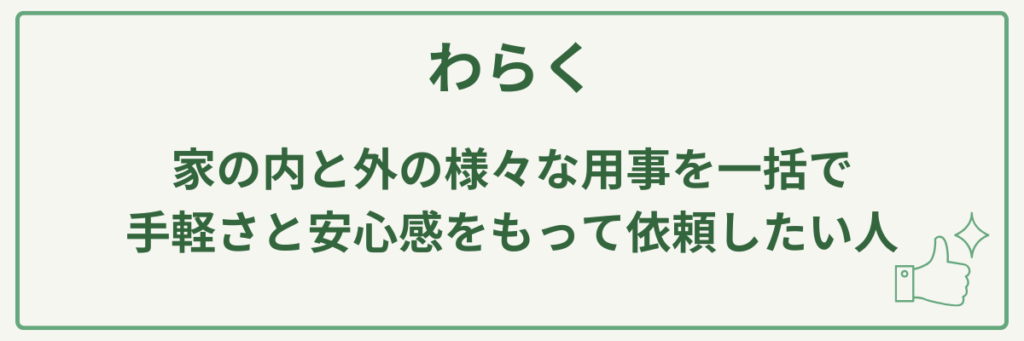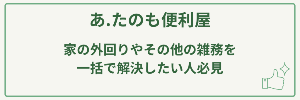 そのため、庭の手入れと同時に、ハウスクリーニングや家具の移動、水回りの小さな修理など、家の内と外の様々な用事を一括で、手軽さと安心感をもって依頼したいと考える人におすすめの総合便利屋です。