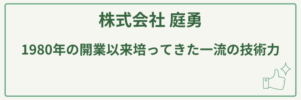 株式会社 庭勇は、1980年の開業以来培ってきた一流の技術力と、本格的な日本庭園からモダン、リゾートガーデンなど洋風庭園まで幅広く対応できる設計・デザイン力が最大の強みです。