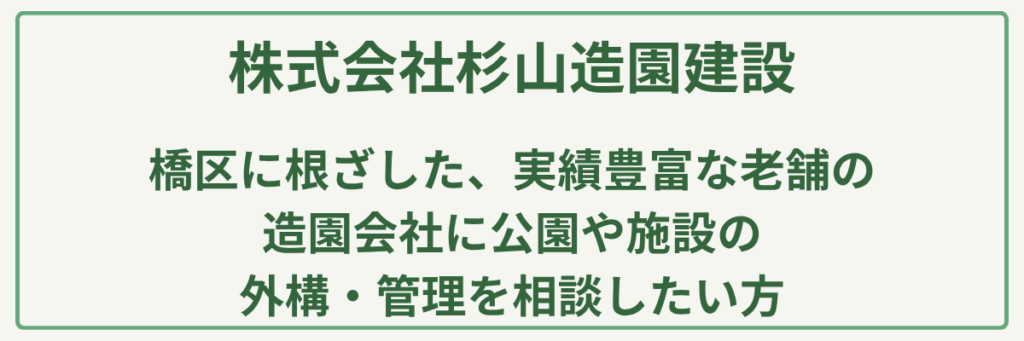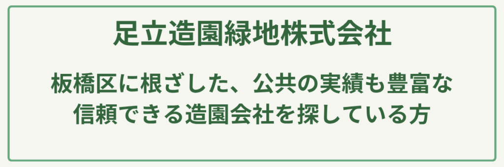 | ポイント | 板橋区大和町拠点の地域密着かつ広域対応企業/官公庁主体とした圧倒的な公共工事実績/街路樹や公園の専門的な維持管理に強み/都内23区から多摩エリアまで網羅する機動力/安全性と技術力が保証された高い信頼性/2025年4月の最新実績更新など活発な運営体制 |