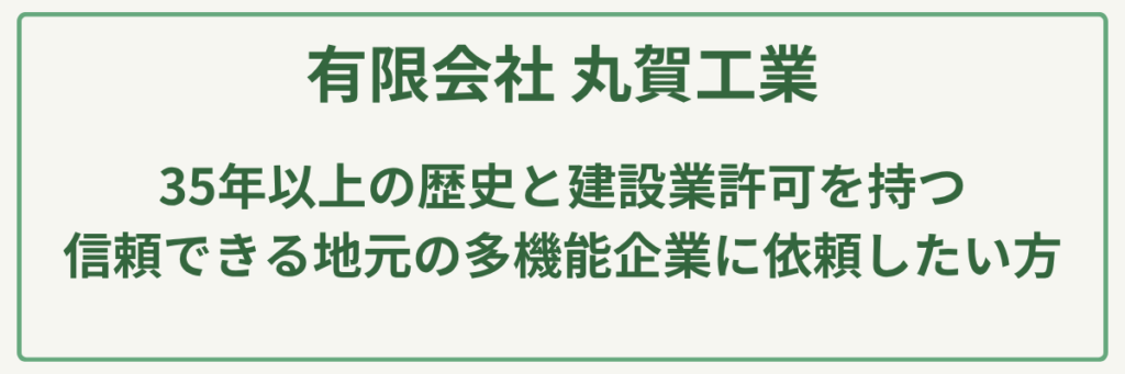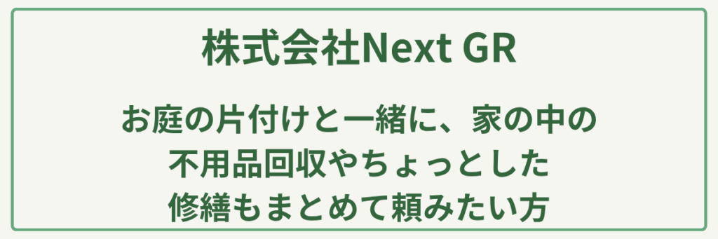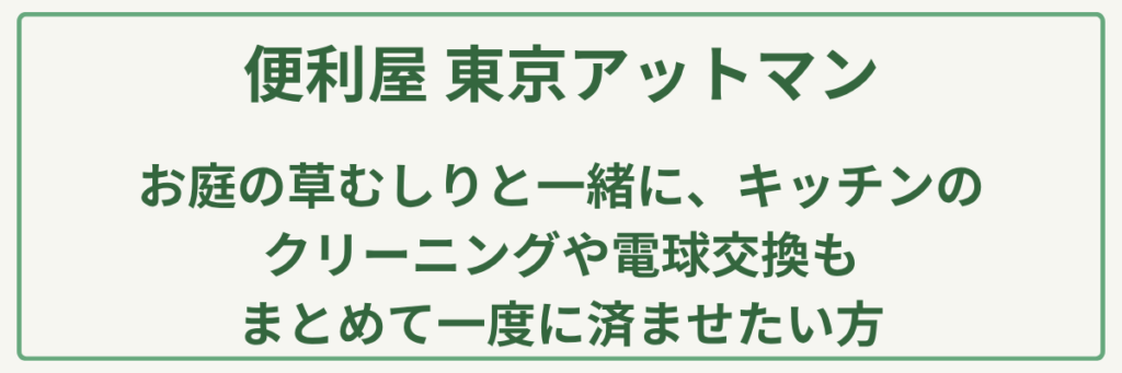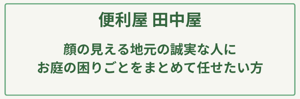 | 対応サービス | 庭木の剪定、草刈り(雑草対策)、不用品回収、家事代行、遺品整理、引っ越し手伝い、緊急の水回り対応 |