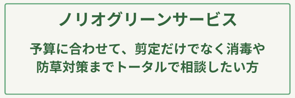| 対応サービス | 庭木の剪定・伐採、草刈り、防草シート施工、消毒、不用品回収 |
