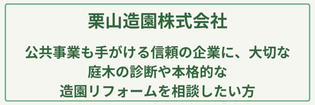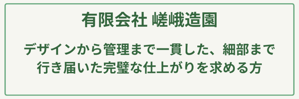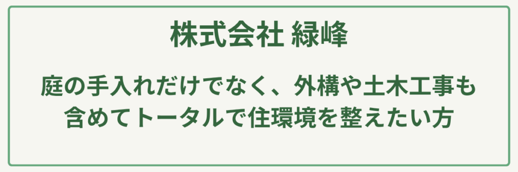 | 対応サービス | 造園設計・施工、樹木管理(剪定・維持管理)、土木工事、外構工事、緑化事業 |