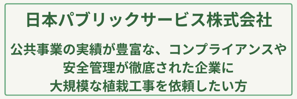 | 対応サービス | 公園造成工事、公園維持管理、街路樹維持管理、官庁造園工事全般 |