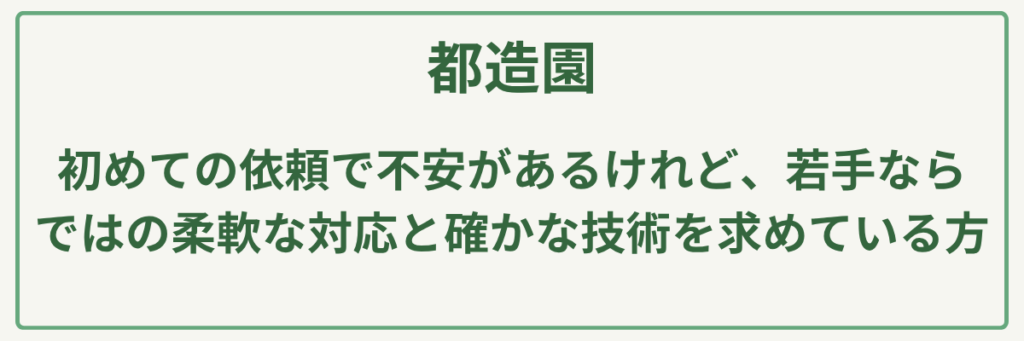 樹形を整えて花や実を楽しめるようにする繊細な剪定から、隣家への越境対策としての強めの伐採まで、住まい手と周囲の環境に配慮した丁寧な仕事を提供しています。**「お庭の将来について専門家のアドバイスを受けながら、じっくり手入れを進めたい方」や「ちょっとした除草や消毒だけをプロに頼みたいけれど、大げさな依頼はしにくいと感じている方」**に非常におすすめです。植物への確かな愛情と、利用者に寄り添う誠実な対応で、暮らしに心地よい緑を届けてくれるパートナーです。