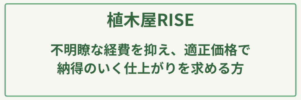 **植木屋RISE(ライズ)**は、東京・埼玉・神奈川を中心に関東全域で活動する、迅速対応とコストパフォーマンスに優れたお庭の専門店です。「庭も人も明るく」をモットーに、年間600件以上の施工実績を誇ります。最大の強みは、仲介手数料や見積もり代を一切排した自社直接施工による「最安値への挑戦」と、夜間受付や即日作業もこなせる圧倒的なスピード感です。庭木の剪定や伐採はもちろん、草刈りや不用品回収まで、お庭の困りごとを幅広く解決しています。