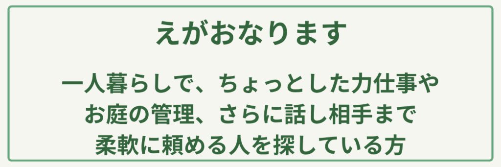 | 対応サービス | 庭木の剪定、草むしり、植木の水やり、簡単な大工仕事、宛名書き、家事援助、襖・障子・網戸の張替え |