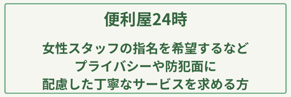 便利屋24時は、埼玉県川口市に拠点を置く「一般社団法人日本遺品整理サポート協会」が運営する、全国対応の総合便利屋サービスです。その名の通り24時間365日いつでも相談が可能で、深夜や早朝の急なトラブルにも迅速に駆けつける機動力を最大の武器としています。「あなたの街の何でも屋さん」として、不用品回収、家事代行、引っ越し手伝いから、専門的な遺品整理まで、住まいとオフィスのあらゆる「困った」をワンストップで解決しています。