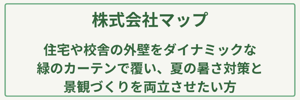 | ポイント | 電気不要の画期的な「マップ式」自動灌水技術を保有/30m級の「超大型緑のカーテン」で多数の実績/日本建築学会ガイドブック掲載や神戸ビエンナーレ入賞の確かな技術/個人邸から大規模施設まで水やりシステムの最適化を提案/メディア掲載多数(「板橋本」等)/環境負荷を低減する都市緑化のスペシャリスト |