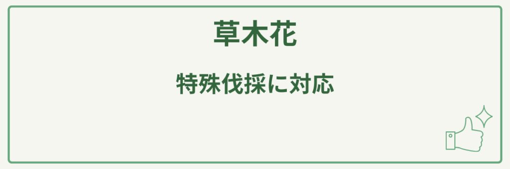 | ポイント | 無料相談・庭木1本からでもOK・業界歴10年以上のスタッフ在籍 |