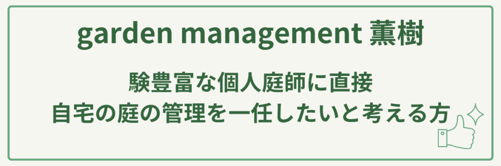 植木屋「garden management 薫樹」は、代表が幼い頃からの植木への熱意と長年の経験を活かし、「大きな造園会社に頼むほどではない」という個人のお客様の具体的な庭の悩みにきめ細かく応えることを強みとしています。
