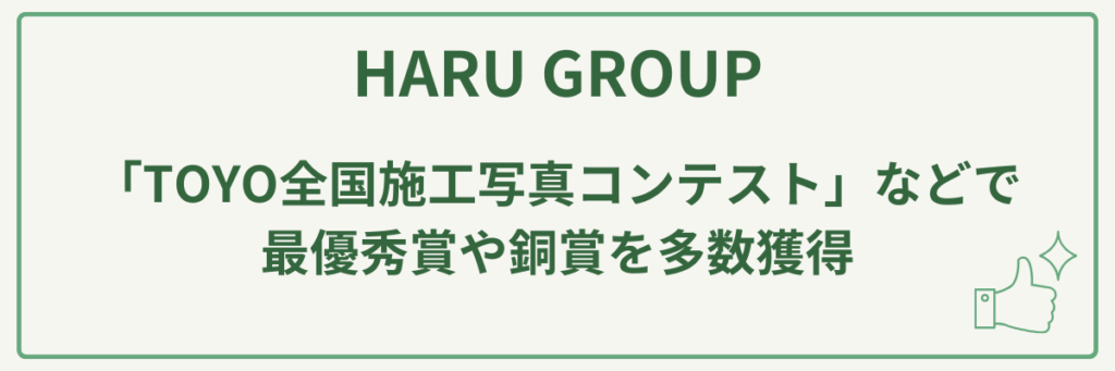HARU GROUP(はる ガーデン&エクステリア)は、「LIXILエクステリアコンテスト」や「TOYO全国施工写真コンテスト」などで最優秀賞や銅賞を多数獲得している、全国レベルの高いデザイン性と確かな施工技術が最大の強みです。