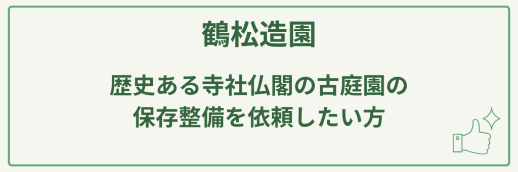 | 対応サービス | 一般造園工事、一般土木工事、工場内緑化工事、グリーンベルト造成、道路植栽、茶室茶庭、霊園開発、公園造成、古代庭園の発掘・調査・復元・補修 |