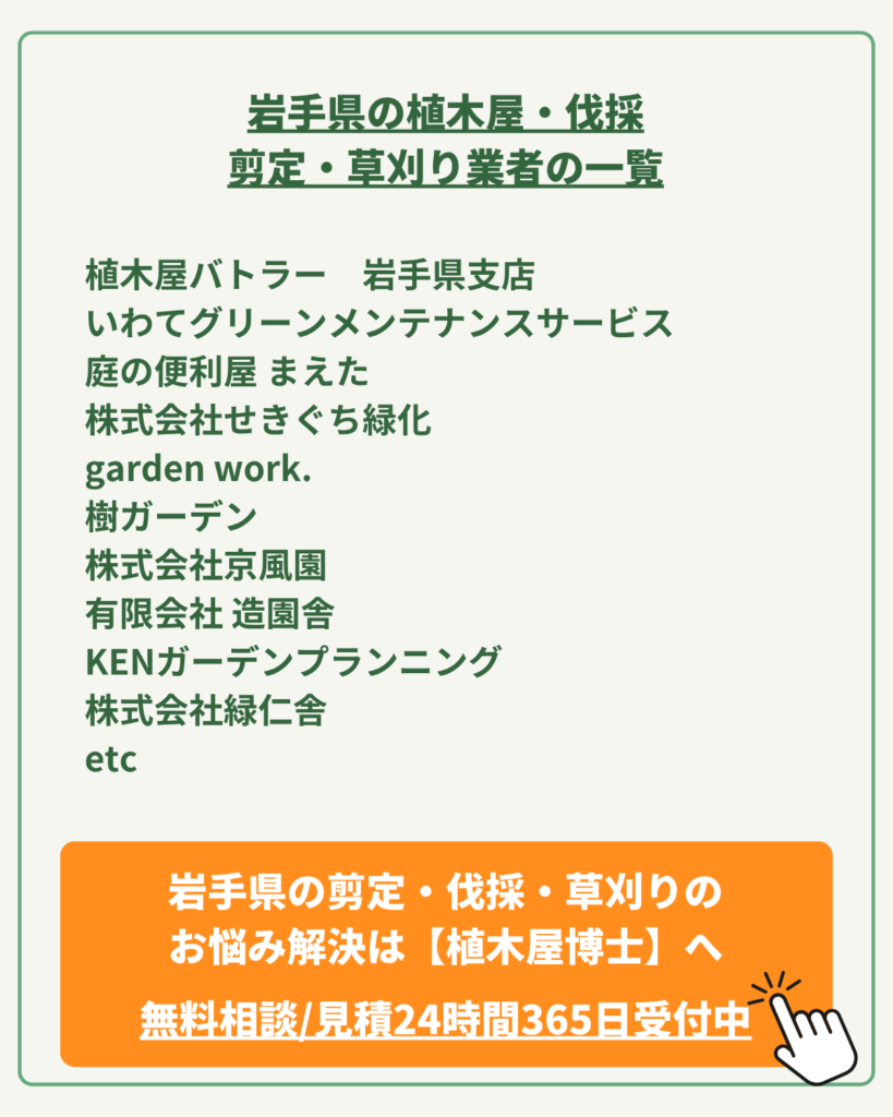 | ポイント | 伐採・除草の専門業者。電線や建物が隣接する「特殊伐採」にも対応。難所の倒木対策や高木の枝下ろしに圧倒的なノウハウを持つ/年中無休、夜21時まで電話受付。急を要する危険木の相談や、日中忙しい方でも連絡が取りやすい充実のサポート体制/個人宅1本から、450㎡を超える大規模店舗の除草まで幅広く対応。諸経費・処分費を含めた見積もりを事前に提示する透明性の高いサービス/伐採後の切り株を取り除く「抜根」から「整地・芝張り」まで一括対応。木を伐った後の土地を美しく蘇らせるトータルプロデュースが可能/公式サイトにて「50mの剪定・伐採」や「店舗裏の除草」など、具体的な費用感を伴う施工事例を公開。予算計画が立てやすい安心の情報開示/盛岡市本宮を拠点に、岩手県内全域をカバー。Google検索や口コミでも高い評価を得ている、地域の環境維持を支える専門企業 |