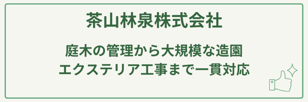 | 対応サービス | 造園・外構・石工事などの設計、施工、管理、植物剪定、移植、販売・生産、屋内外の空間装飾 |