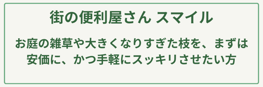 特に草刈りや伐採、空き家の管理、物置の解体など、自分で行うには労力がかかる作業を、親身になって代行してくれます。担当の志良以(シライ)氏による誠実な対応は、「どこに頼めばいいかわからない小さな悩み」を抱える多くの方から支持されています。 「お庭の雑草や大きくなりすぎた枝を、まずは安価に、かつ手軽にスッキリさせたい方」や「終活や引越しに伴う片付けと一緒にお庭の手入れも頼みたい方」に非常におすすめです。見積もりだけでも快く応じてくれる、文字通り「笑顔(スマイル)」になれる親切な一軒です。