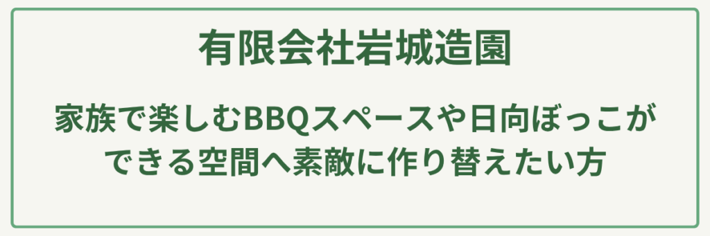 | 対応サービス | エクステリア・外構工事、造園工事、ウッドデッキ施工・リメイク、アプローチ舗装、石組、生垣、庭木のメンテナンス |