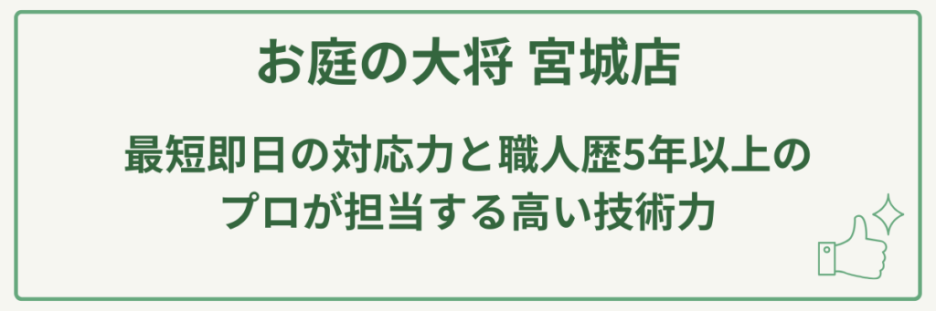 お庭の大将 宮城店は、最短即日の対応力と、職人歴5年以上のプロが担当する高い技術力が最大の強みです。