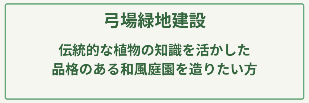 | 対応サービス | 造園工事(和・洋庭園)、エクステリア設置、土木工事、建設工事、苗販売(えびね、寒蘭、万年青等) |