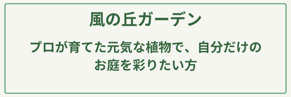 | ポイント | 農場直送の鮮度と、15年以上の栽培実績に裏打ちされた最高品質の植物提供/プロの知恵が詰まった「ガーデニング手帖」で、育て方の悩みを解決するサポート体制/季節の移ろいを感じるオープンガーデンと、金土限定ランチによる心豊かな体験/「ふるさと納税」や通販を通じて、全国どこでも風の丘の寄せ植えが楽しめる利便性/手作り教室やイベントを通じて、植物好きのコミュニティを育む開かれた活動姿勢 |