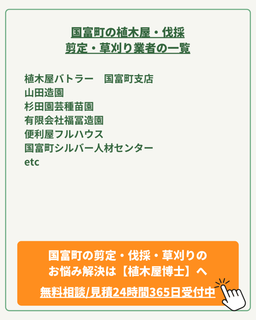 今回は、そんなお悩みを抱えるあなたに向けて、植木屋博士運営が、国富町の植木屋さん達をご紹介します。