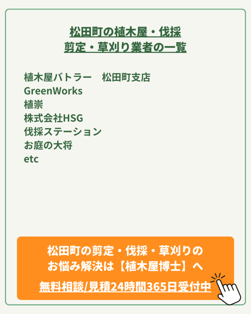 植木屋(剪定・伐採・草刈り業者)選びでお悩みの方は、是非この機会に植木屋博士の無料相談・無料見積をご活用ください。