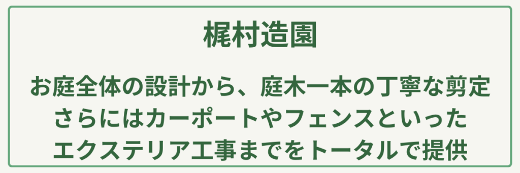 | 対応サービス | 造園工事・外構工事・土木工事・緑化管理・剪定・経年管理 |