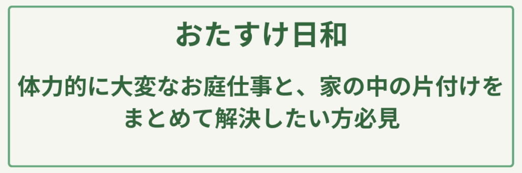 愛媛県松山市を中心に展開するおたすけ日和は、**「5分単位の明快な料金計算」と「最短即日のスピード対応」が大きな強みの便利屋・家事代行サービスです。植木屋としての作業も精力的に行っており、草刈りや庭木の伐採、枝の整理といったお庭のメンテナンスを1回数千円からの低予算で依頼できます。特に「作業前後を写真で報告する丁寧なフィードバック体制」**が整っているため、離れて暮らすご家族からの依頼や空き家管理にも定評があります。