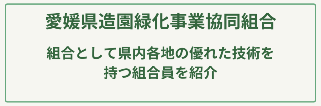 | ポイント | 設立50周年(令和8年度)を迎える愛媛県内最大級の造園ネットワーク/黄綬褒章受章者や1級造園技能士、1級造園施工管理技士などの高度な技術者が多数在籍/伝統的な松の剪定から最新の造園技法まで、専門講習会を通じて技術を磨き続ける職人集団/自治体の補助金制度(生垣・庭作り等)に精通し、申請を含めたトータルアドバイスが可能/県内全域をカバーする組合員紹介により、地域に密着した迅速かつ丁寧な施工を実現 |