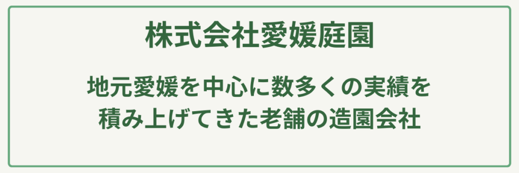 | ポイント | 資本金2,700万円、愛媛県知事許可(第6365号)を保有する組織としての高い信頼性/河川・橋梁・トンネル工事等の公共インフラも手掛ける、地域トップクラスの高度な土木技術/剪定(1人役18,000円〜)など、明朗で分かりやすい料金表の提示による安心感/「庭と遊ぶ」をテーマに、四季の移ろいや心のゆとりを大切にした独自の空間デザイン提案/土地造成から植栽まで、お庭の土台作りから完成までを一貫して任せられる総合施工体制 |