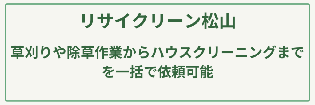 | 対応サービス | 草刈り・芝刈り、木の剪定・伐採、不用品片付け、ハウスメンテナンス、空家管理、ハウスクリーニング、各種代行 |