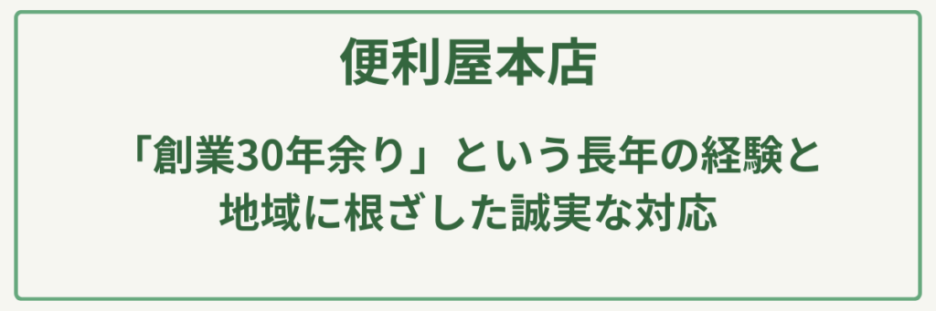愛媛県松山市を中心に活動する便利屋本店は、「創業30年余り」という長年の経験と地域に根ざした誠実な対応が最大の強みです。庭木の剪定や伐採、草刈りといったお庭のメンテナンスはもちろん、不用品回収や遺品整理、さらにはハウスクリーニングや各種代行まで、住まいに関するあらゆる困りごとにワンストップで対応できる**「多機能なサポート体制」**を整えています。
