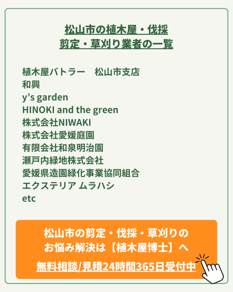今回は、そんなお悩みを抱えるあなたに向けて、植木屋博士運営が、松山市の植木屋さん達をご紹介します。