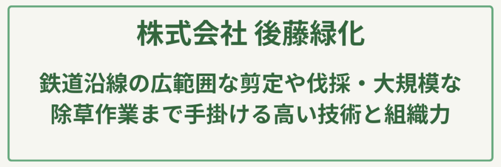 | ポイント | 鉄道沿線の管理も担う確かな技術力/「緑の安全管理士」在籍による専門的防除/薬剤散布による効率的な除草対応/自社施工による明朗会計・予算別提案/外構・カーポート等の工事も一括対応可能/早朝7時からの迅速な営業体制 |