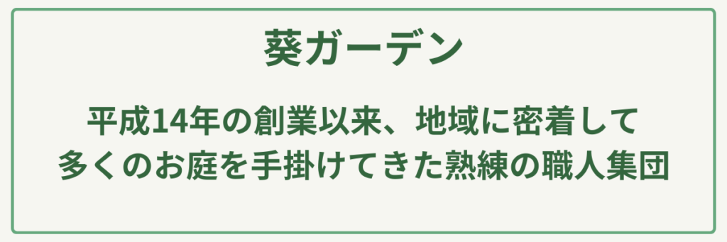 三鷹市を拠点に調布、練馬、杉並など幅広いエリアで活動する葵ガーデンは、平成14年の創業以来、地域に密着して多くのお庭を手掛けてきた熟練の職人集団です。「迅速、丁寧、安心」を経営理念に掲げ、個人宅からマンション管理、公共施設まで多岐にわたる施工実績を積み重ねてきました。