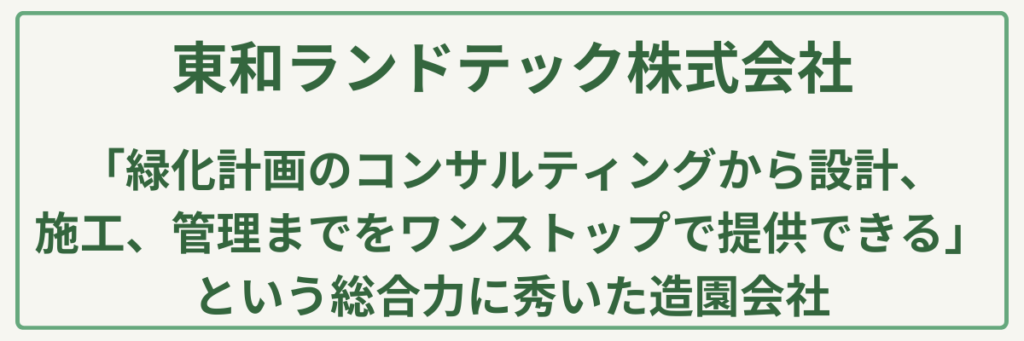 三鷹市を拠点に首都圏全域で活動する東和ランドテックは、「緑化計画のコンサルティングから設計、施工、管理までをワンストップで提供できる」という総合力に秀いた造園会社です。個人庭園はもちろん、都市公園や学校、商業施設、さらには大規模な都市開発に至るまで、公共・民間の垣根を越えた圧倒的な施工実績を誇ります。