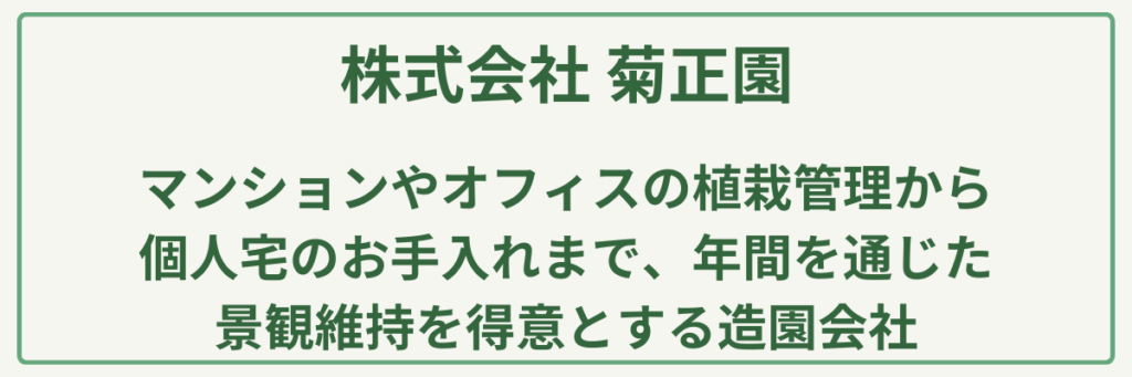 府中市を拠点に一都三県で幅広く活動する「株式会社 菊正園(きくせいえん)」は、マンションやオフィスの植栽管理から個人宅のお手入れまで、年間を通じた景観維持を得意とする造園会社です。有資格者による専門的な技術と豊富な経験を活かし、樹木一本の剪定から、草刈り、施肥、消毒にいたるまで、植木の状態に合わせたきめ細やかな対応を提供しています。