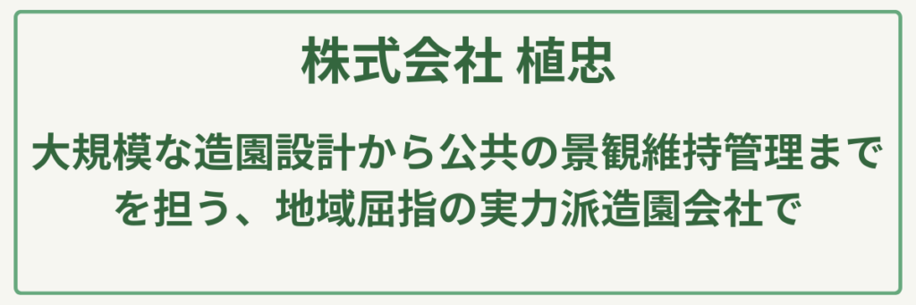 | 対応サービス | 造園設計・施工、植栽管理(剪定・防除)、観葉植物レンタル、屋上緑化、グリーンコーディネート、TM9(芝生)販売 |
