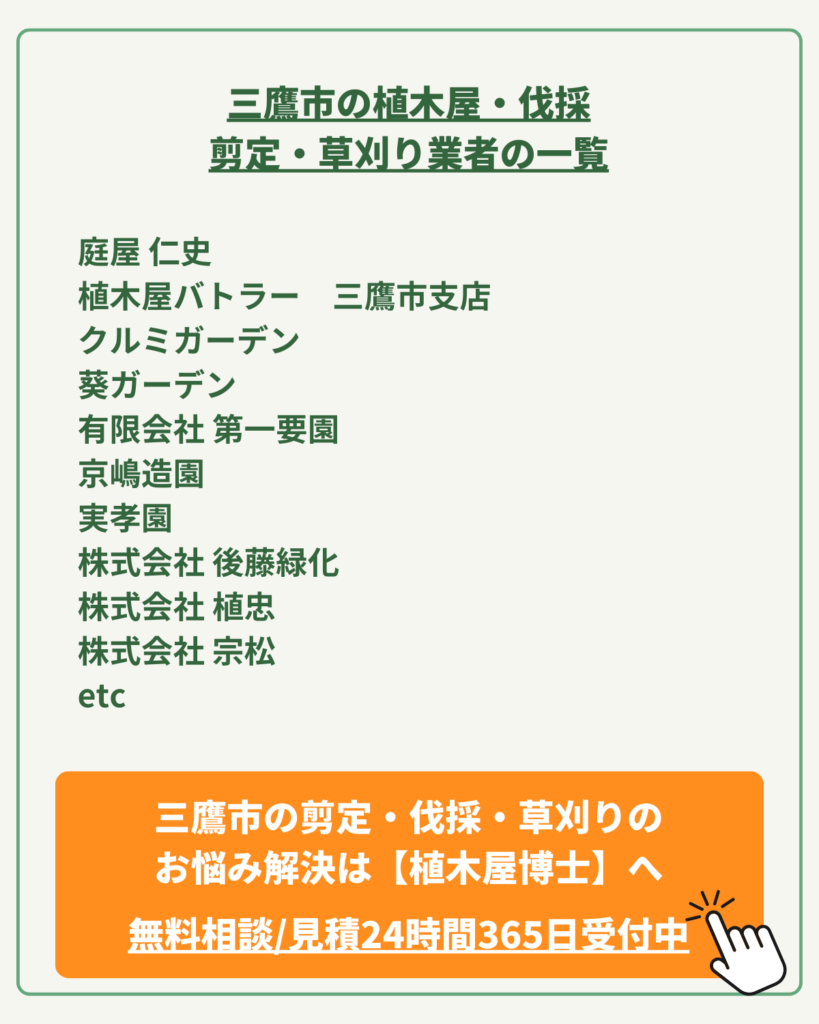 | ポイント | 熟練の技術を安心価格で提供/見積もり無料・相談歓迎/公式LINEでの簡単問い合わせ対応/三鷹・武蔵野エリア密着の迅速な対応/「迅速・丁寧」をモットーとした誠実な施工/小規模な手入れから伐採まで柔軟に対応可能 |