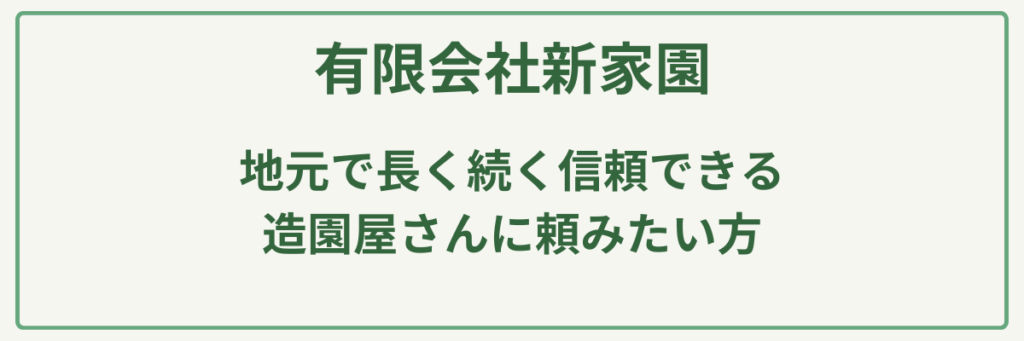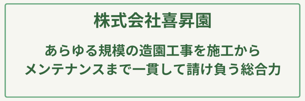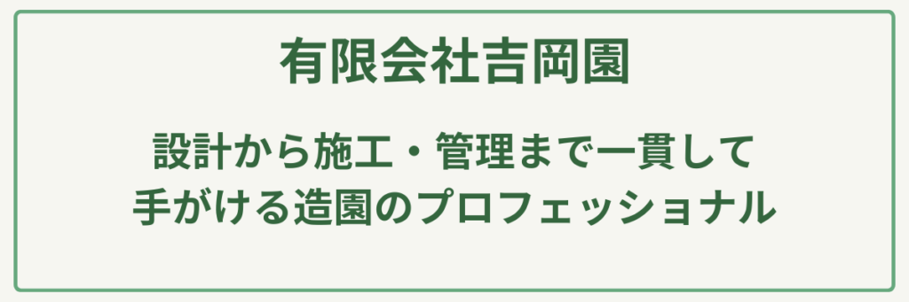 | 対応サービス | 造園工事一式、緑地管理、外構工事、アフターフォロー、植栽メンテナンス |