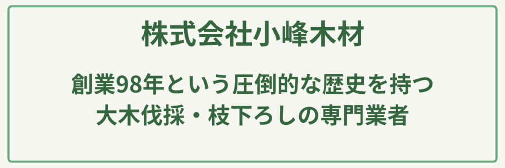 株式会社小峰木材は、東京都瑞穂町を拠点に創業98年という圧倒的な歴史を持つ、大木伐採・枝下ろしの専門業者です。最大の強みは、社長自らが専属の**「空師(そらし)」**として木に登り、重機が入れないような狭小地や寺社の境内でも、ロープワークを駆使して安全に作業を行う高度な技術力にあります。
