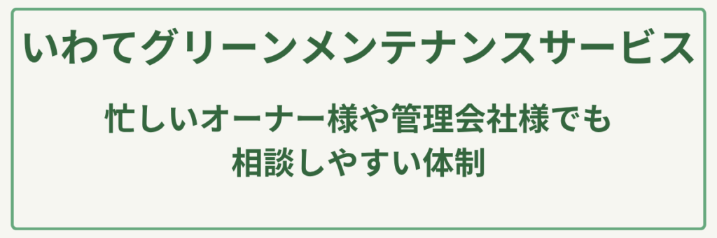 | ポイント | 自社スタッフによる「オールインワンサービス」で余計なコストを排除。庭木1本3,000円〜という納得の低価格設定を実現/岩手県内全域(盛岡・滝沢・花巻・沿岸部等)で見積り・出張費無料。事前見積り後の追加請求がない安心の明朗会計/「庭木1本」「枝1本」からOK。大規模な造園だけでなく、ちょっとしたお手入れにも柔軟に対応する高いフットワーク/「立ち会いなし」での遠隔作業が可能。県外在住者による実家の庭管理や空き家の定期メンテナンス需要に特化したプランを用意/プロの職人が理想の形を丁寧にヒアリング。施工後に仕上がりを一緒に確認するプロセスを徹底し、イメージの相違を防ぐ誠実な仕事/2024年にサイトを開設。電話だけでなく、メールやお問い合わせフォームから24時間相談可能。急ぎの案件にも迅速なスケジュール提示で対応 |