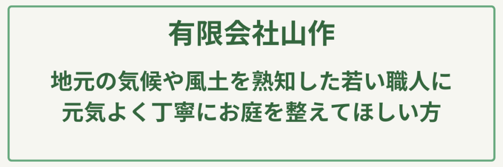 | ポイント | 自然の素材と施主様の気持ちを繋ぐ、温かみのあるオーダーメイドの庭づくり/伝統的な和風庭園から、フェンスやテラスを含む現代的な外構まで幅広く対応/松くい虫防除や高所での枝下ろしなど、高度な専門知識と技術を要する管理業務に強み/道の駅での苔玉販売など、植物の魅力を身近に伝える地域に根ざした活動/庭木の「移植」にも対応しており、大切に育ててきた樹木を次世代へ繋ぐサポート/公式Webサイトでの豊富な施工例公開により、事前に仕上がりのイメージを確認可能 |