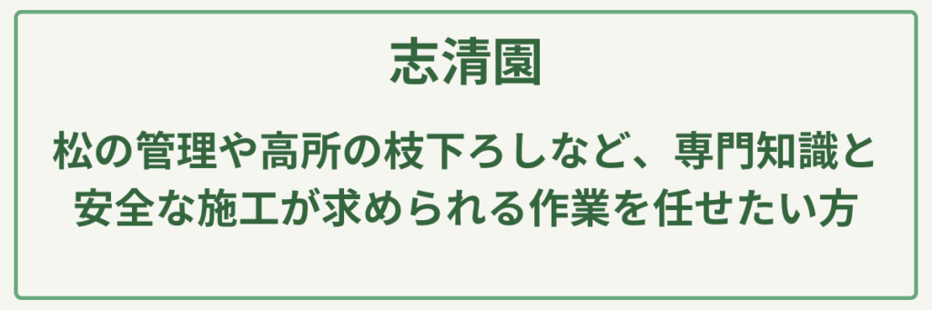 | 対応サービス | 作庭工事、庭木剪定、庭木管理、伐採・枝下ろし、庭木移植、松くい虫防除、高所作業、真砂土舗装、竹垣設置 |