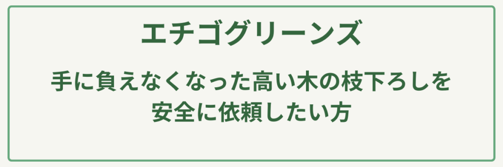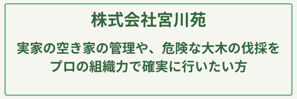 | 対応サービス | 庭木の伐採・剪定・伐根、草刈り・除草剤散布、枝葉処分、管理不全物件(空き家)の庭木管理、庭仕舞い、雨樋・屋根の掃除 |