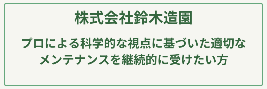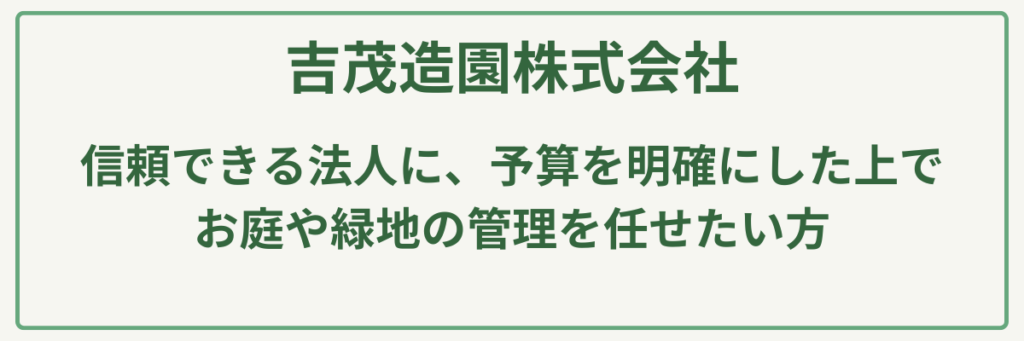 | 対応サービス | 造園工事、剪定(高木・軽剪定)、刈込剪定、機械除草、冬囲い、公共・民間施設の緑地メンテナンス |