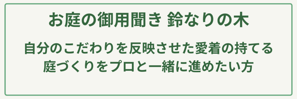 | 対応サービス | 造園設計・施工、ガーデニング、エクステリア工事、庭木剪定、リガーデン、外構工事、燈篭・石材設置 |