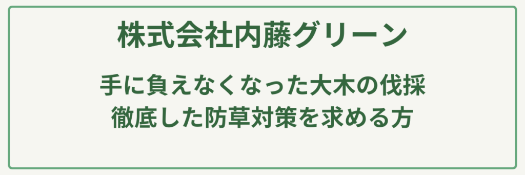 | 対応サービス | 剪定・伐採(枝打ち)・草刈り・新築外構・植栽・防草工事・害虫防除 |